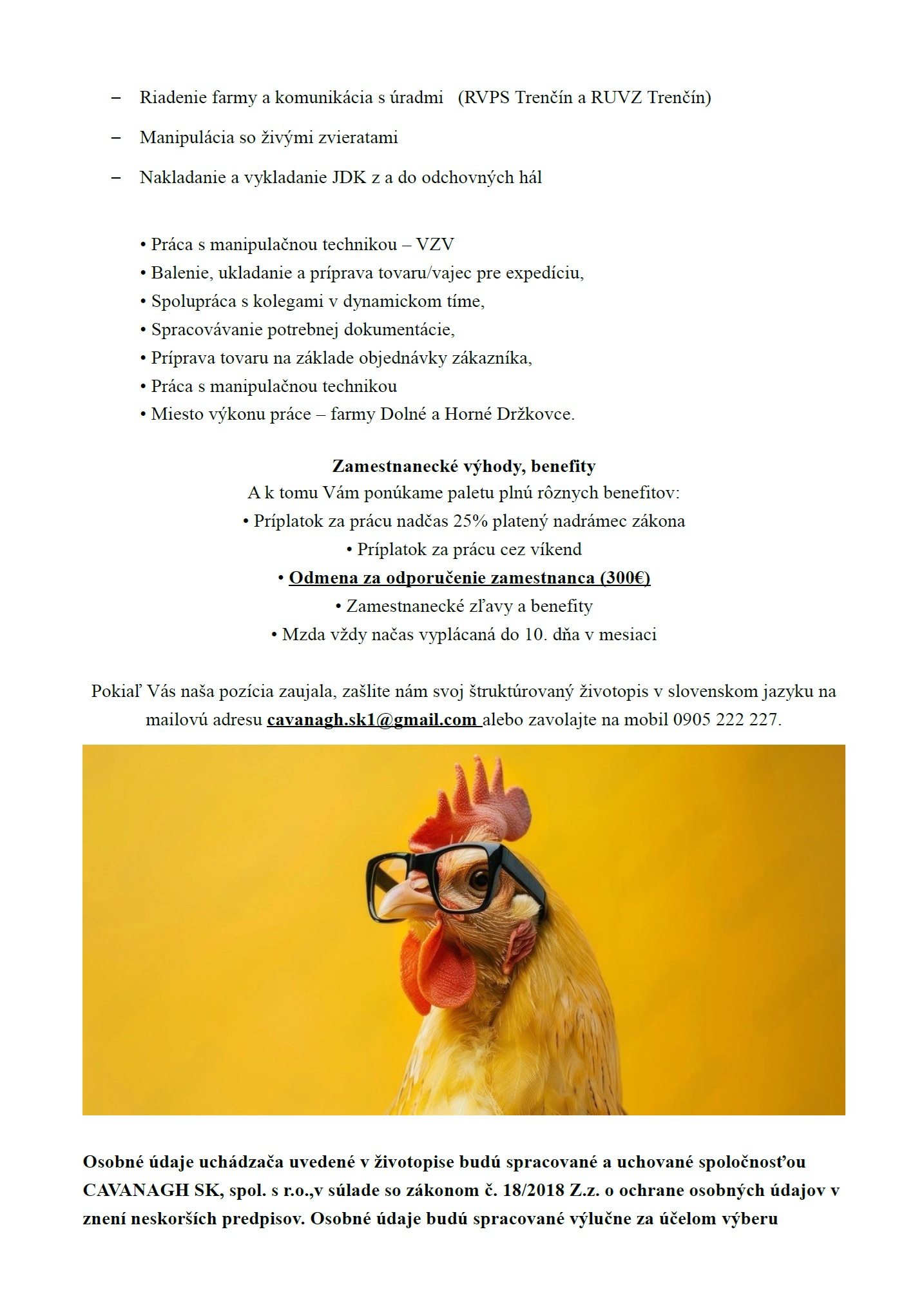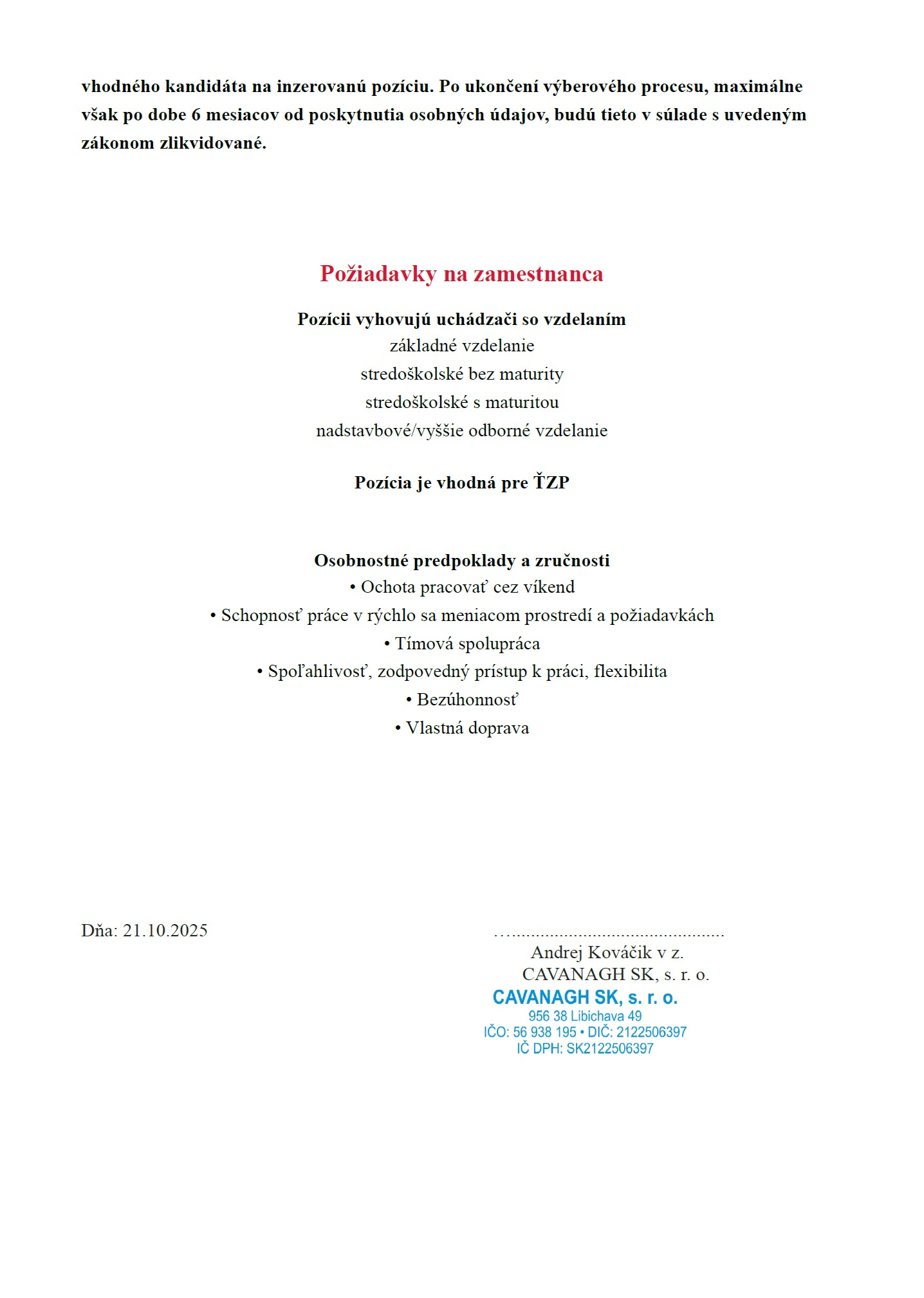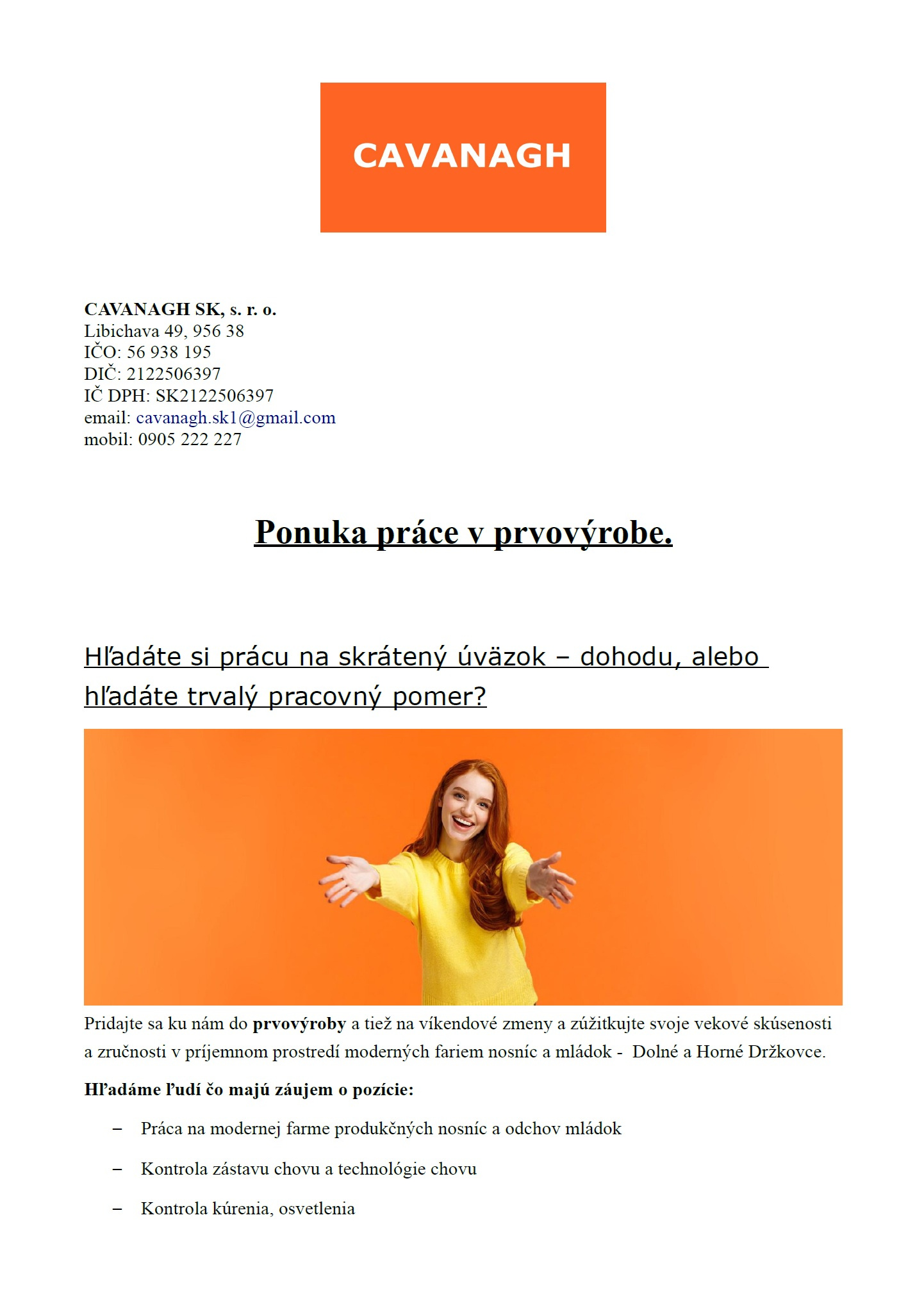 CAVANAGH SK, s.r.o. - Ponuka práce v prvovýrobe
