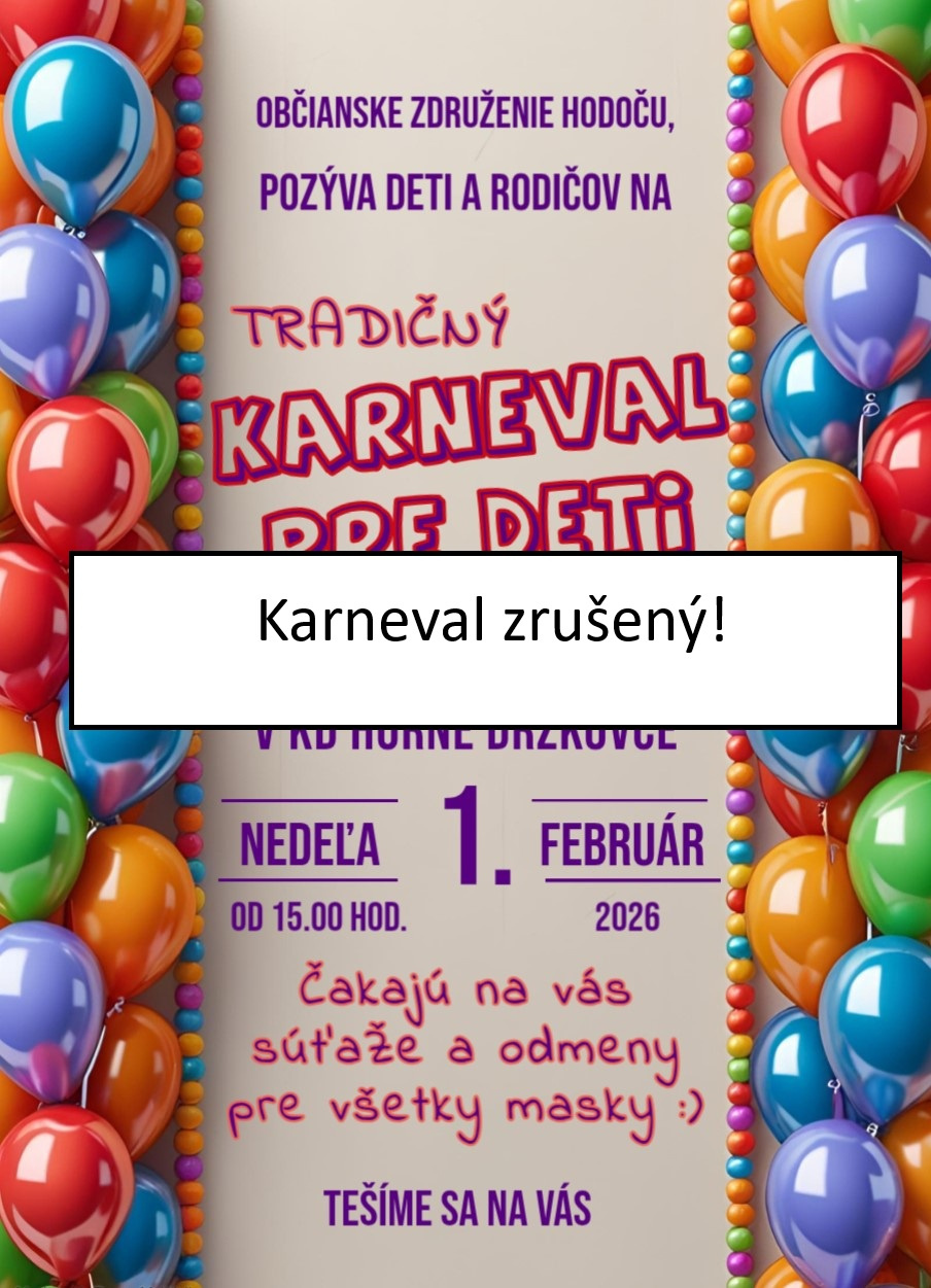 Občianske združenie HODOČU oznamuje deťom a rodičom, že Karneval, ktorý sa mal uskutočniť dňa 1. februára, je kvôli vysokej chorobnosti ZRUŠENÝ. Ďakujeme za porozumenie.