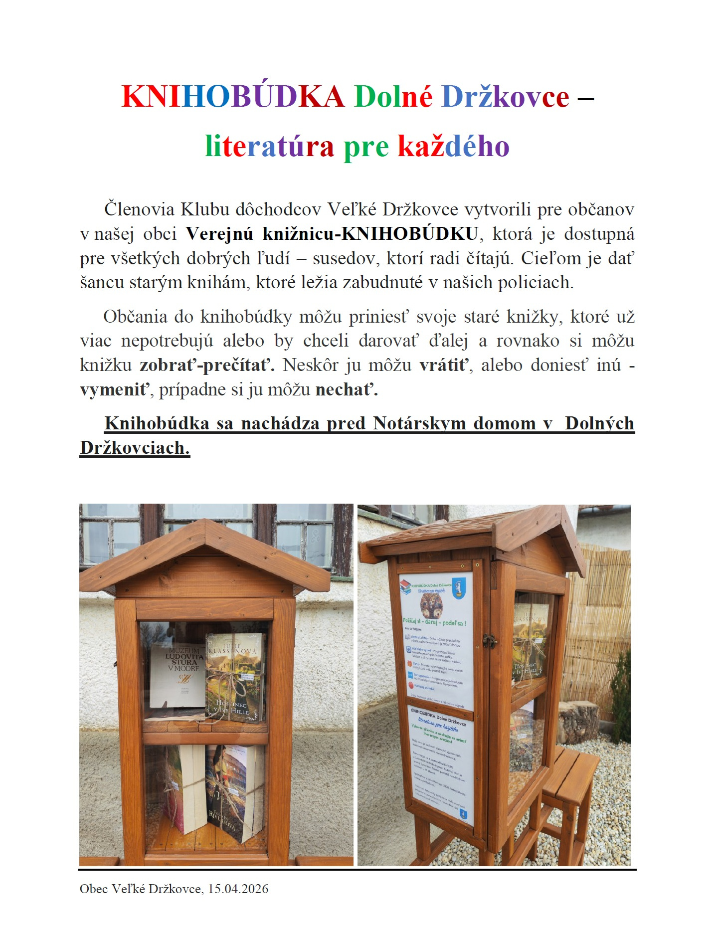 Členom Klubu dôchodcov Veľké Držkovce za vytvorenie Knihobúdky v našej obci srdečne ďakujeme.