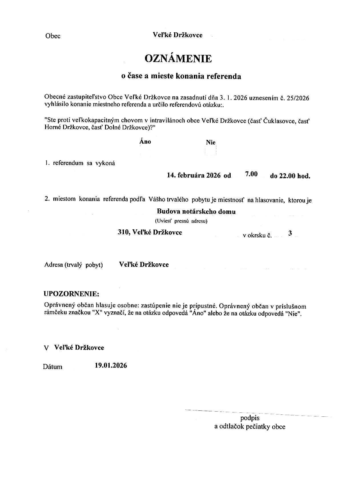 Oznamujeme občanom, ktorí majú adresu trvalého pobytu obec Veľké Držkovce, že miestom hlasovania v miestnom referende, ktoré sa uskutoční dňa 14. 2. 2026, je okrsok č. 3 - Dolné Držkovce.