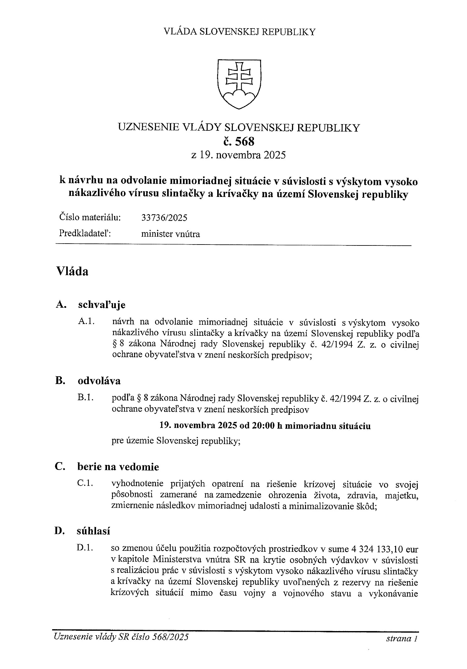 Odvolanie mimoriadnej situácie - vysoko nákazlivého vírusu slintačky a krívačky - vyrozumenie