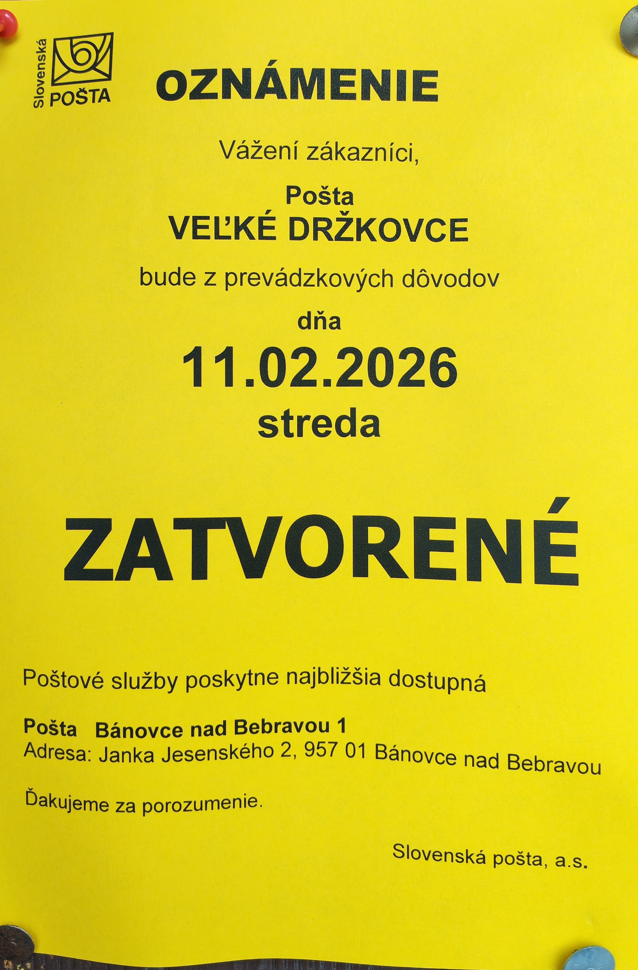 OZNAM - POŠTA 11.02.2026 - ZATVORENÁ