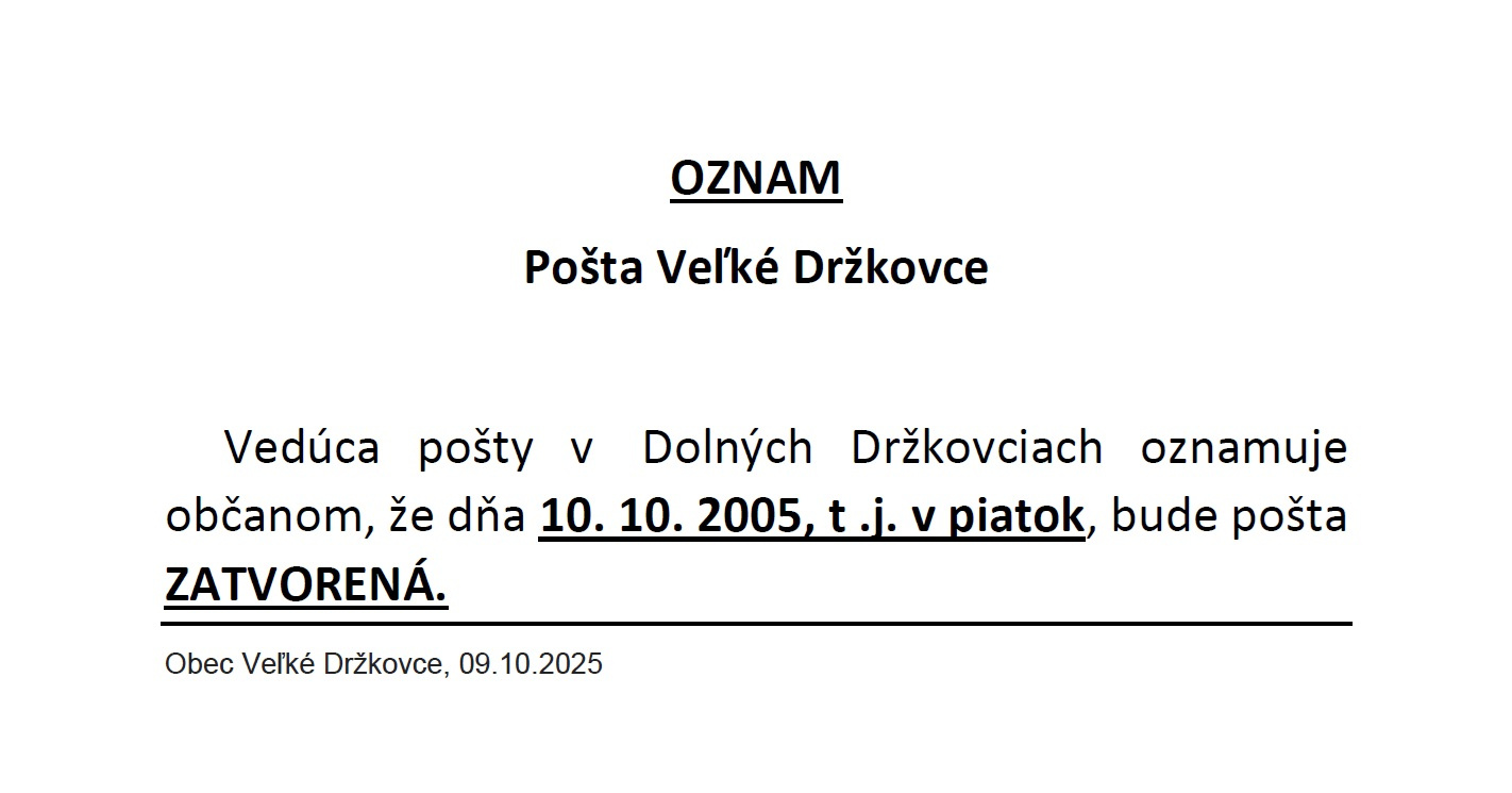 Oznámenie o úprave hodín pre verejnosť - Pošta Veľké Držkovce