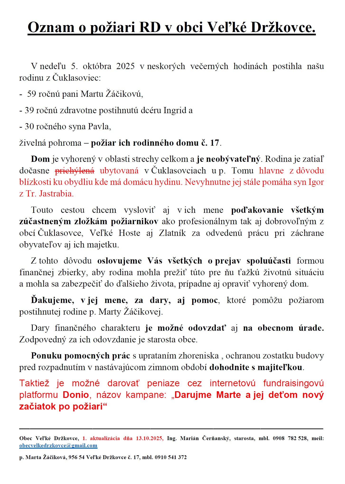 Oznam o požiari RD v obci Veľké Držkovce - 1. aktualizácia