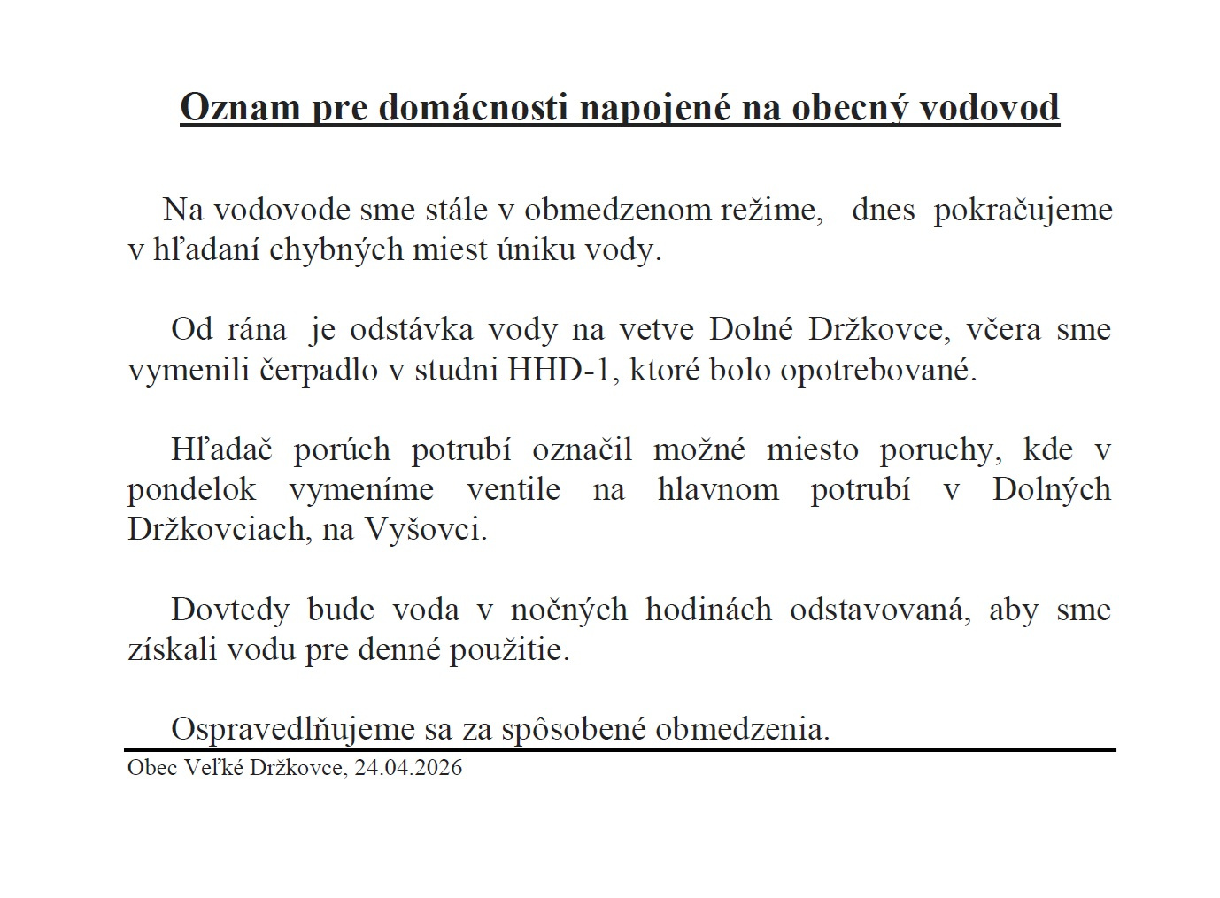 Odstávka dodávky vody v Dolných Držkovciach