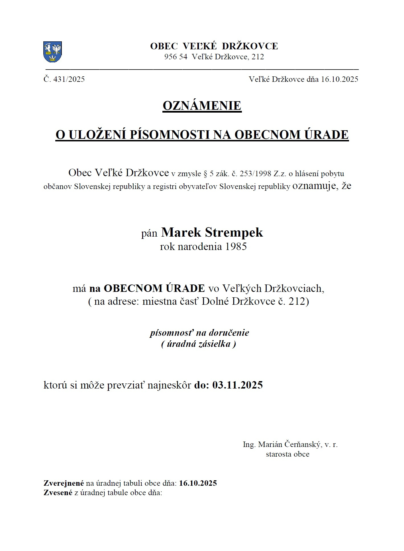 Oznámenie o uložení písomnosti na obecnom úrade - Marek Strempek