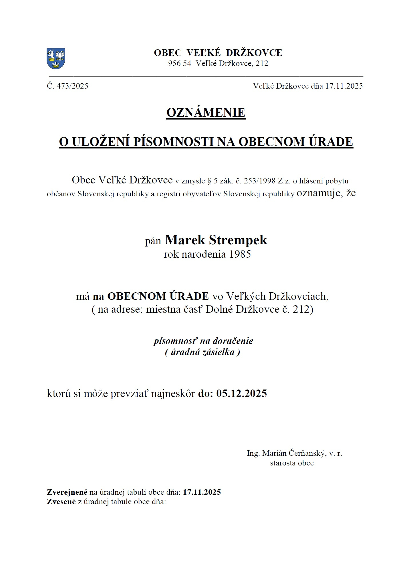 Oznámenie o uložení písomnosti na obecnom úrade - Marek Strempek