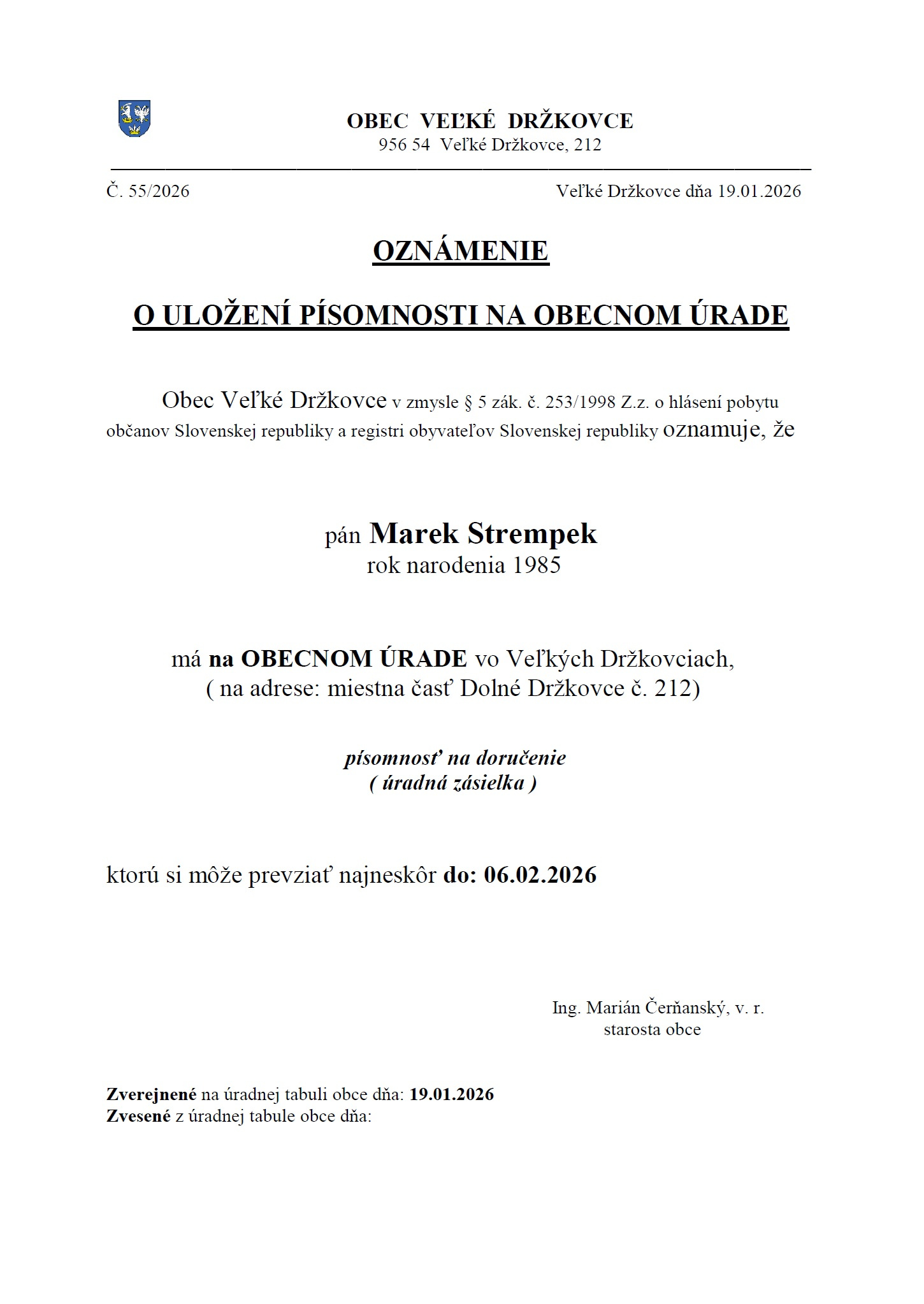 Oznámenie o uložení písomnosti na obecnom úrade - Marek Strempek