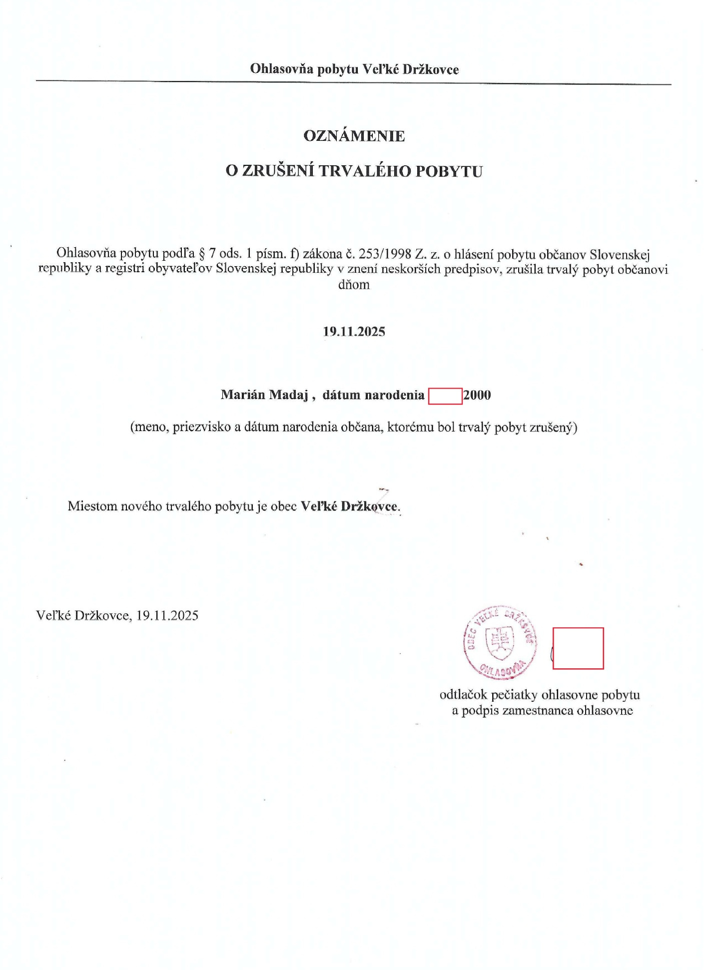 Oznámenie o zrušení trvalého pobytu - Marián Madaj