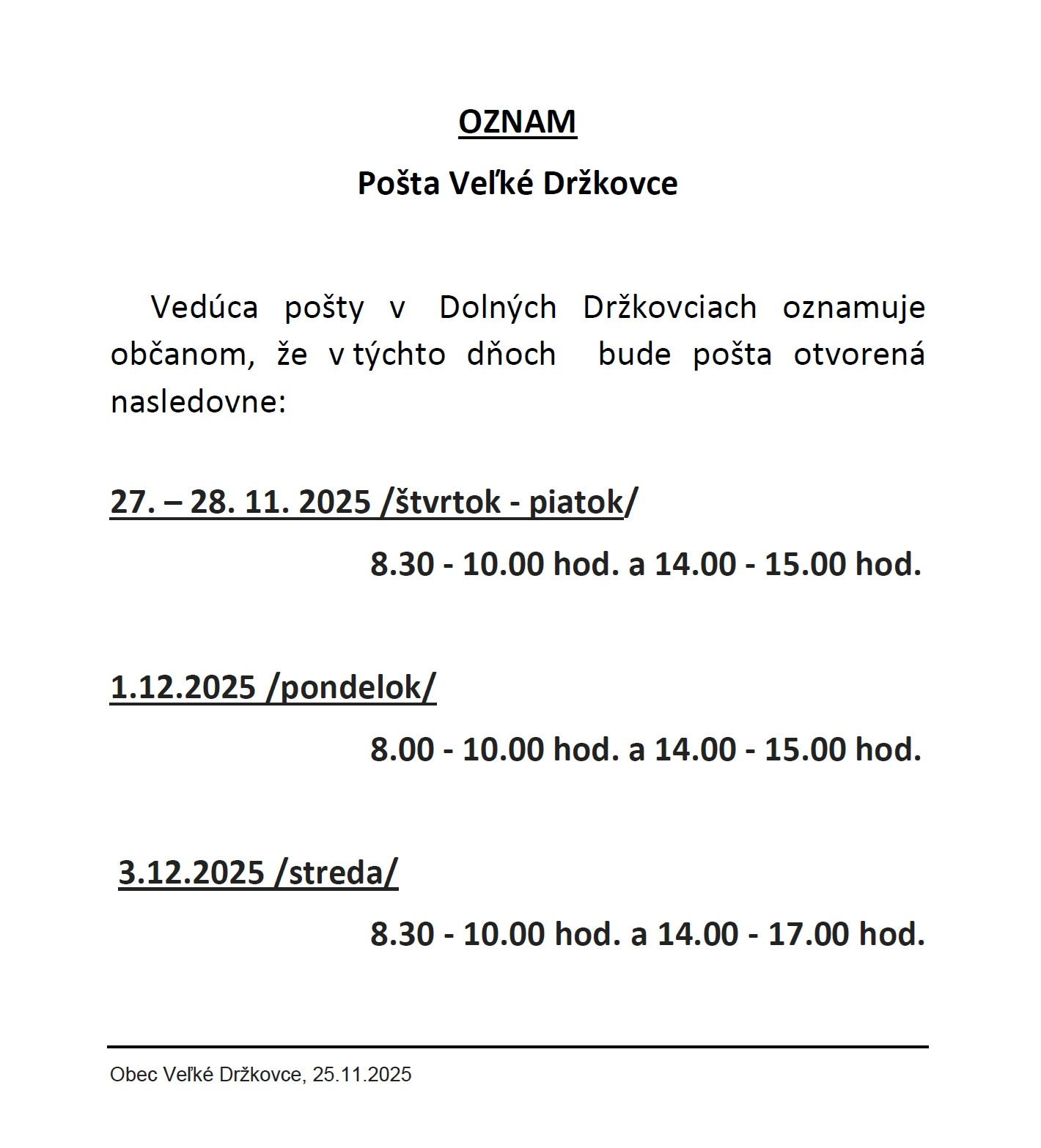 Pošta Veľké Držkovce - Oznámenie o úprave hodín pre verejnosť