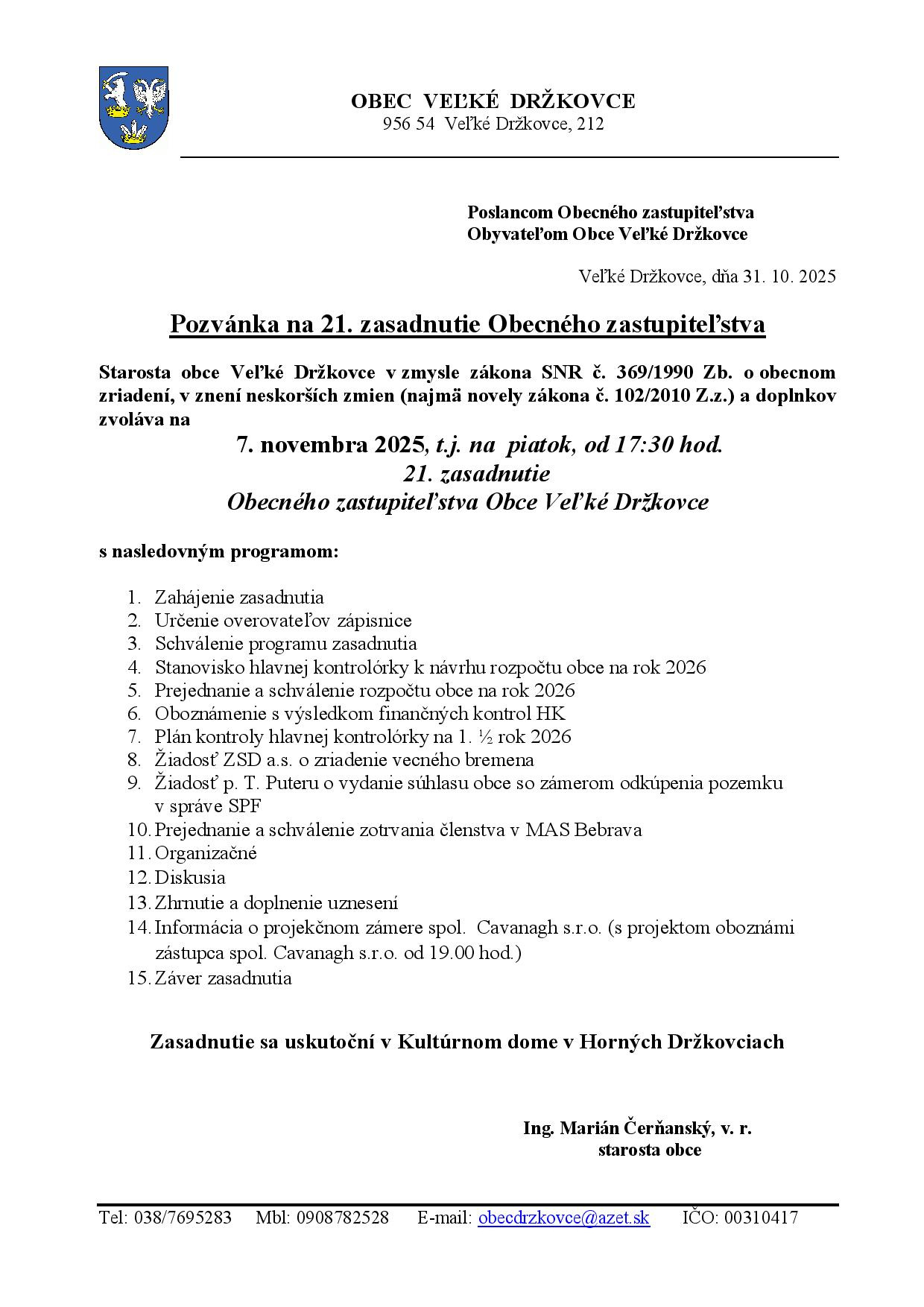 Pozvánka na 21. zasadnutie obecného zastupiteľstva