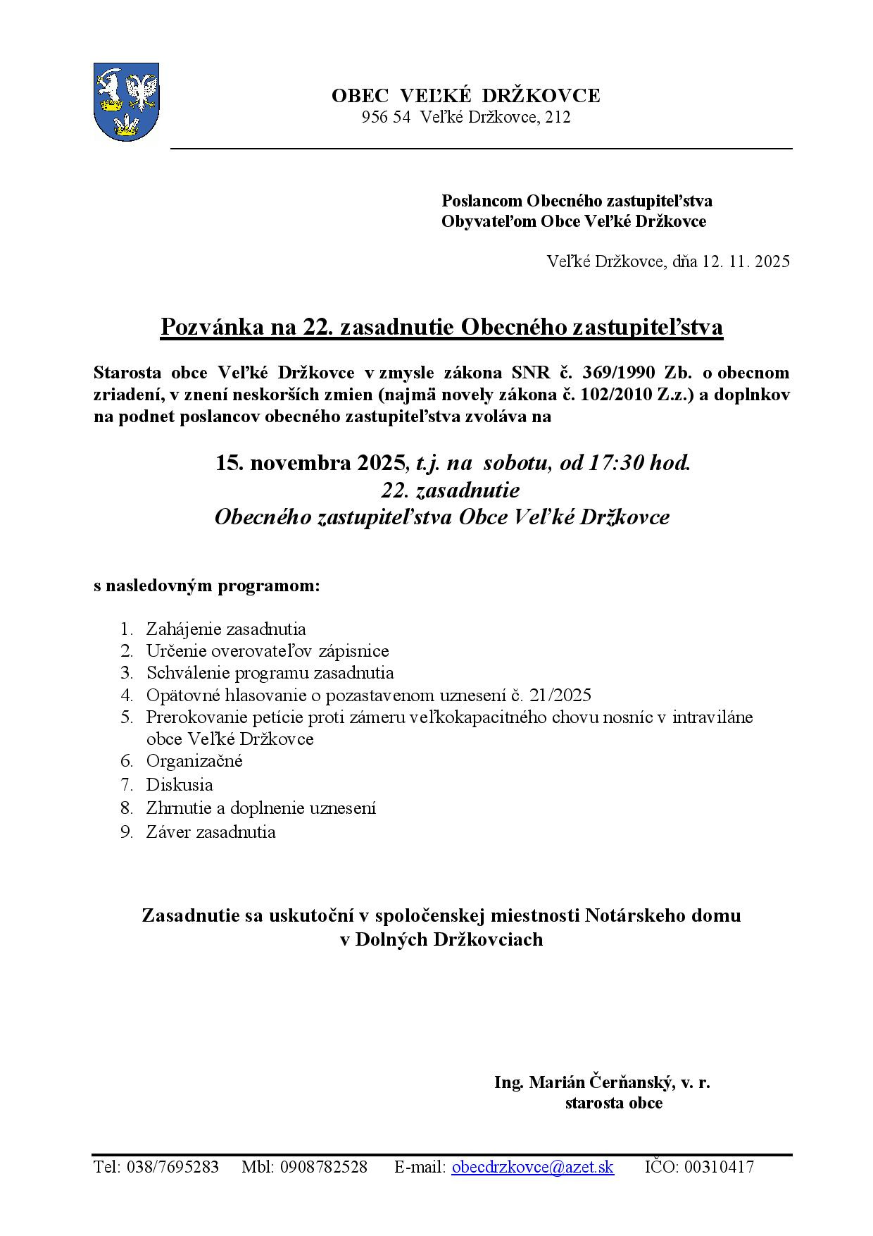 Pozvánka na 22. zasadnutie obecného zastupiteľstva