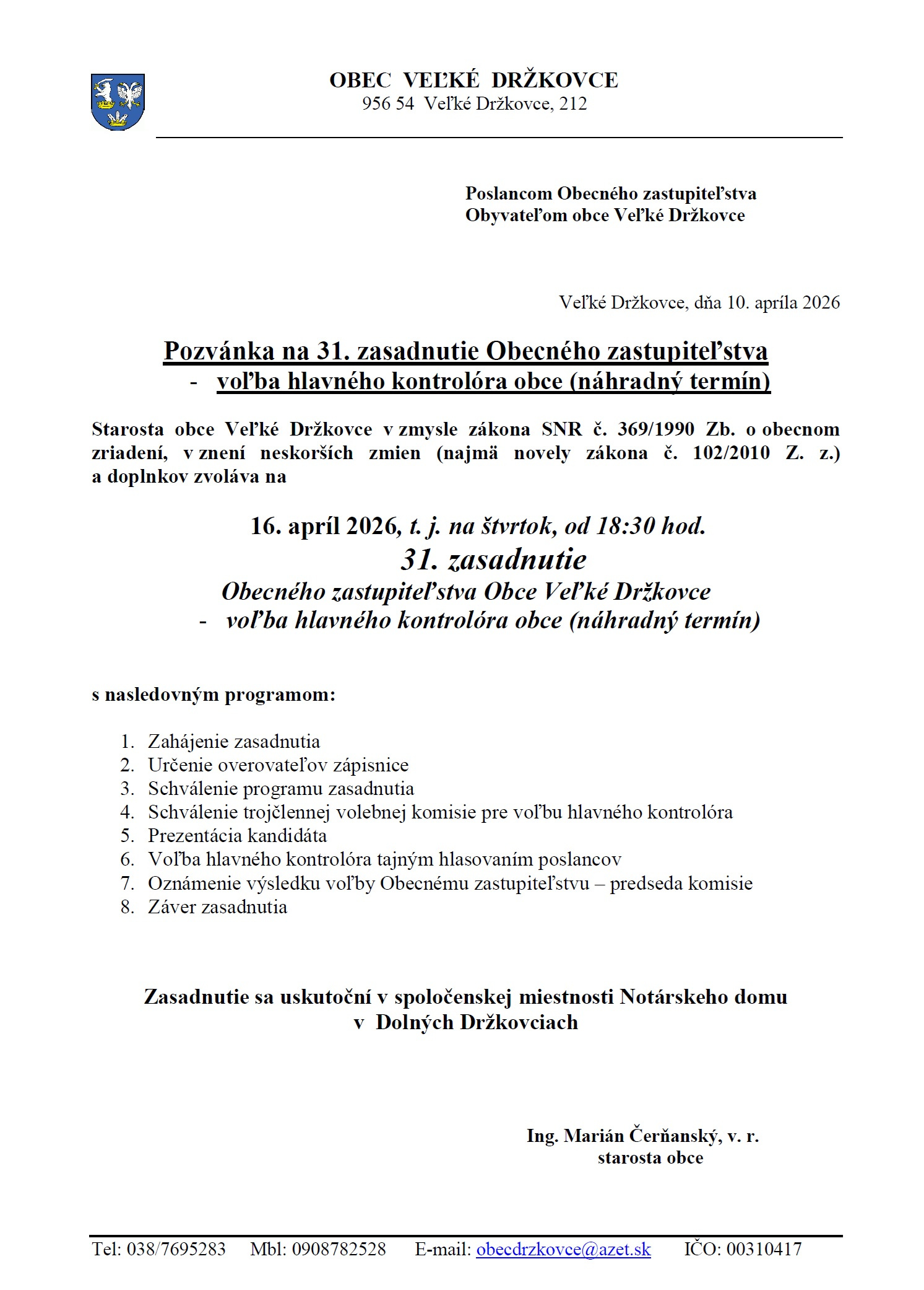 Pozvánka na 31. zasadnutie Obecného zastupiteľstva - voľba hlavného kontrolóra obce (náhradný termín