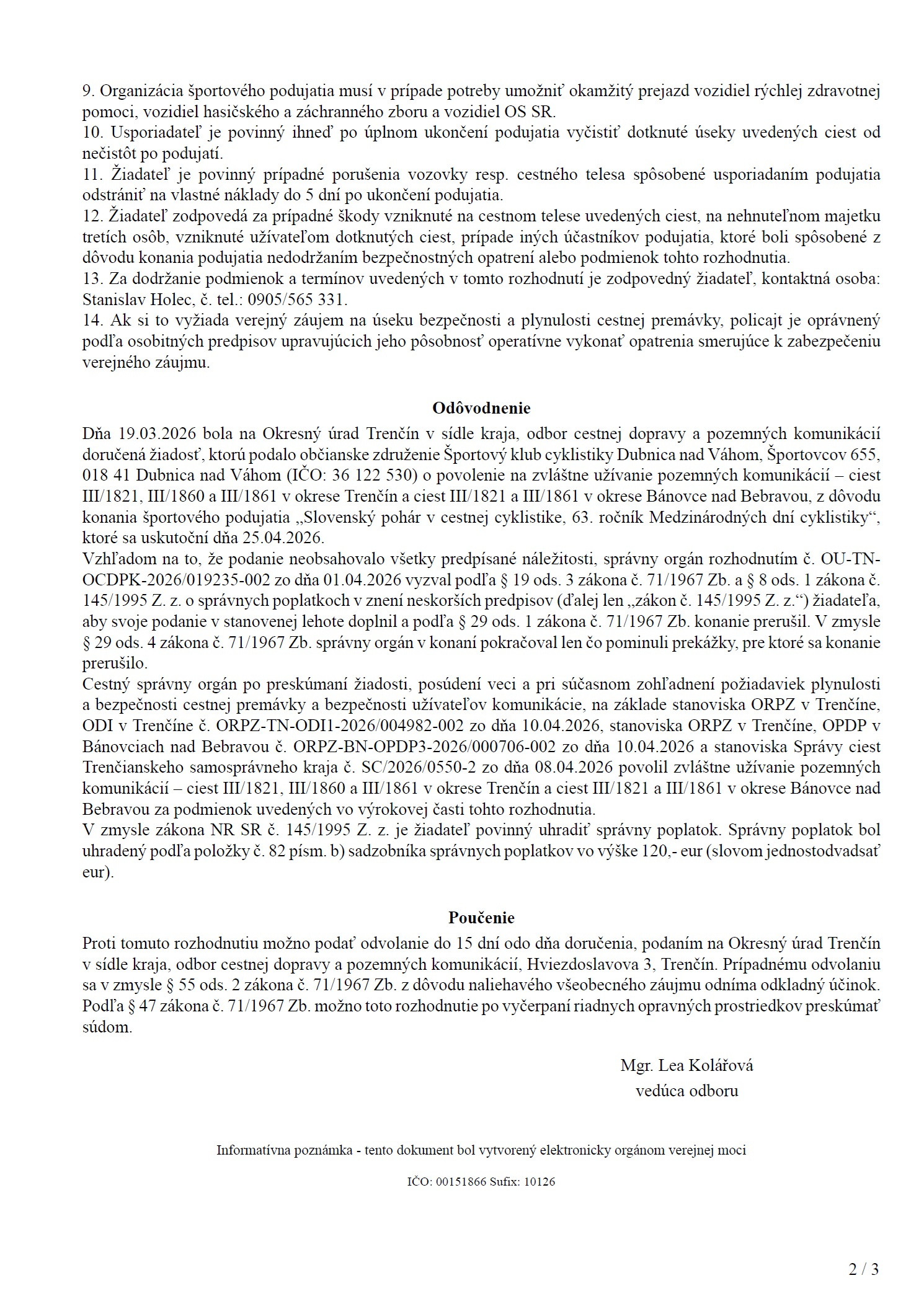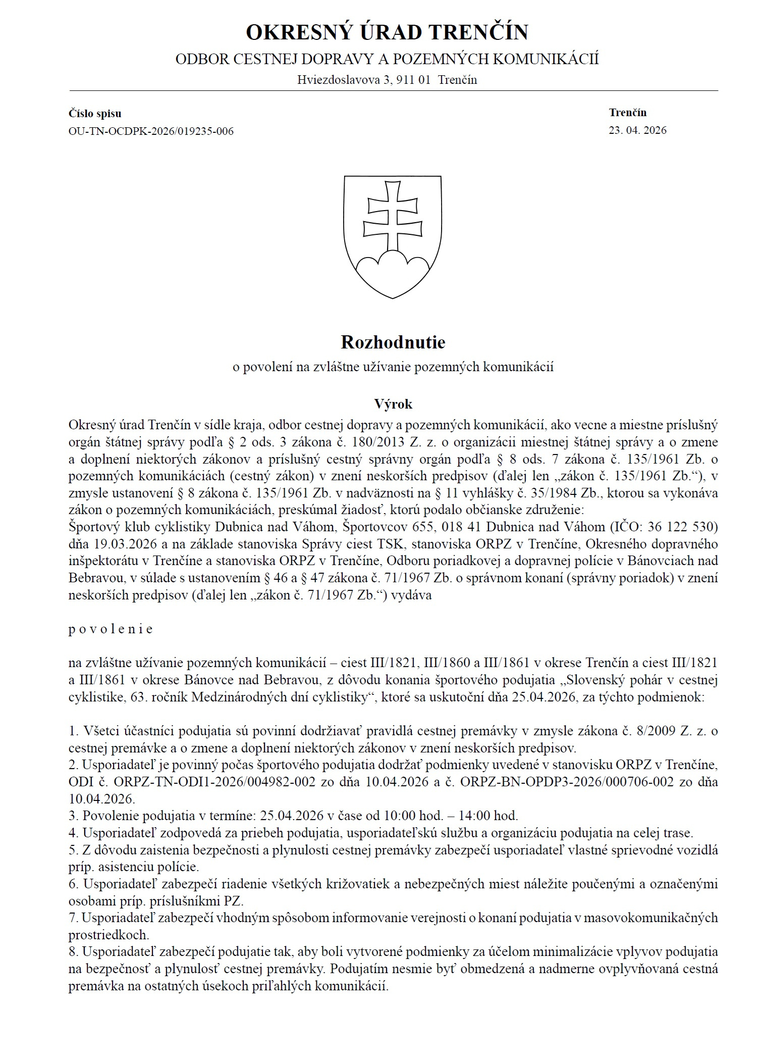 Rozhodnutie o povolení na zvláštne užívanie pozemných komunikácií - Okresný úrad Trenčín