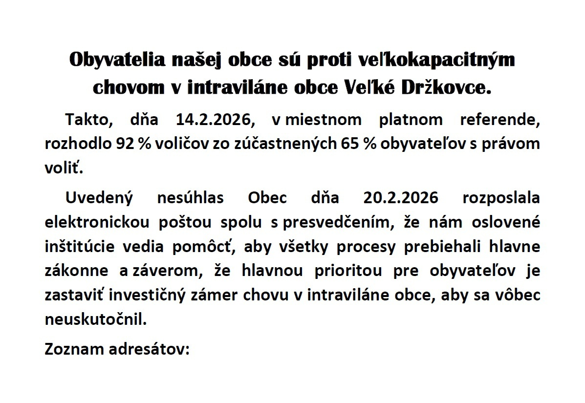 Miestne referendum 2026 - Vyhlásenie Obce Veľké Držkovce o výsledkoch Miestneho referenda