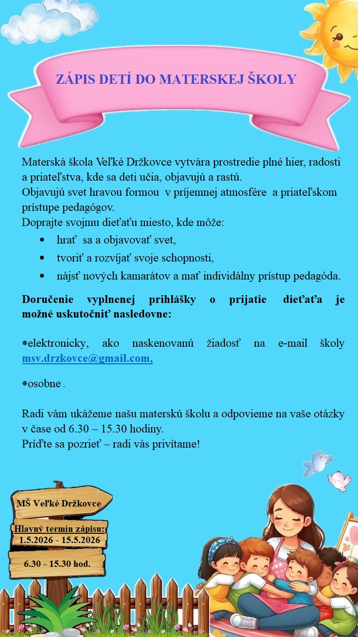 Dieťa sa do materskej školy prijíma na základe prihlášky na vzdelávanie v materskej škole - prihláška sa podáva na formulári schválenom a zverejnenom ministerstvom školstva na https://edicnyportal.iedu.sk/Forms. Je zverejnená aj na webovej stránke obce v záložke školstvo.